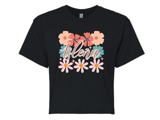 Crop Top “Isleña” con Diseño Floral – Camiseta Estilo Verano Disponible en Negro, Gris, Rosa y Blanco